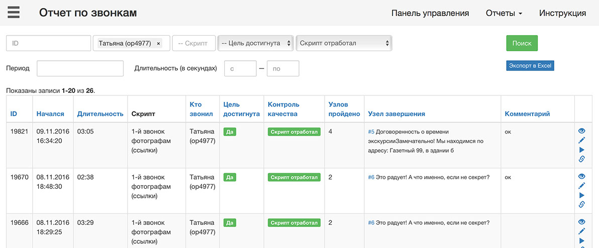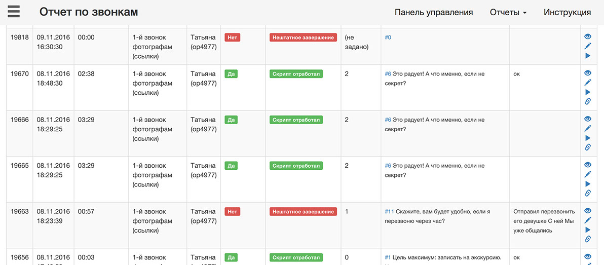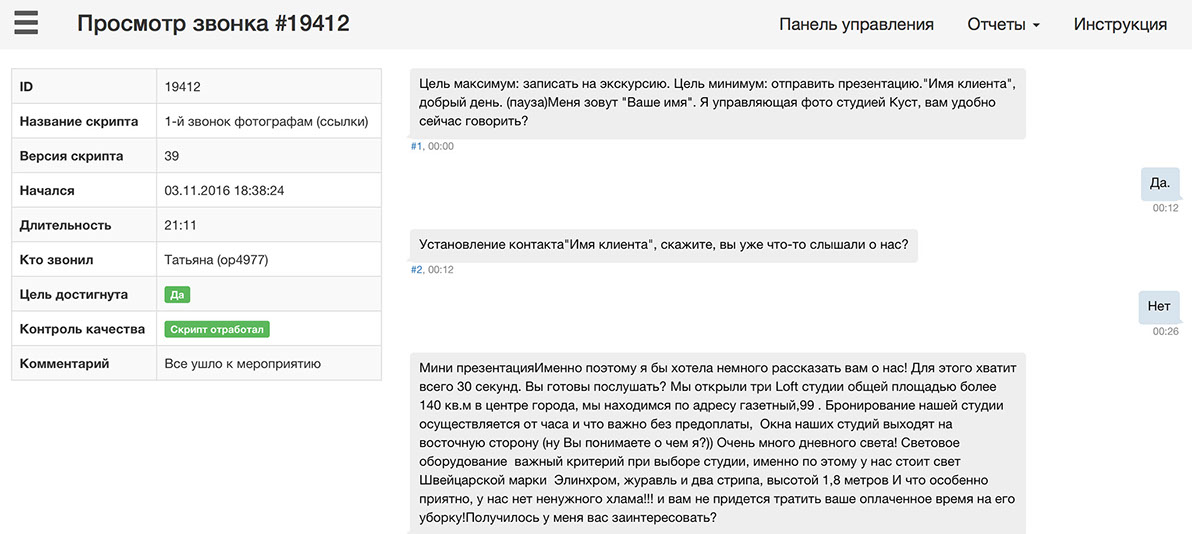 Мы точно отслеживаем сколько узлов скрипта было пройдено и чем закончился диалог менеджера с клиентом.