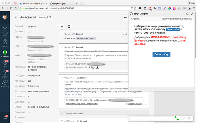 Менеджеру достаточно 1 раз кликнуть по иконке в правом верхнем углу браузера и скрипт готов к работе! Ваша CRM и скрипт теперь находятся в одном окне.